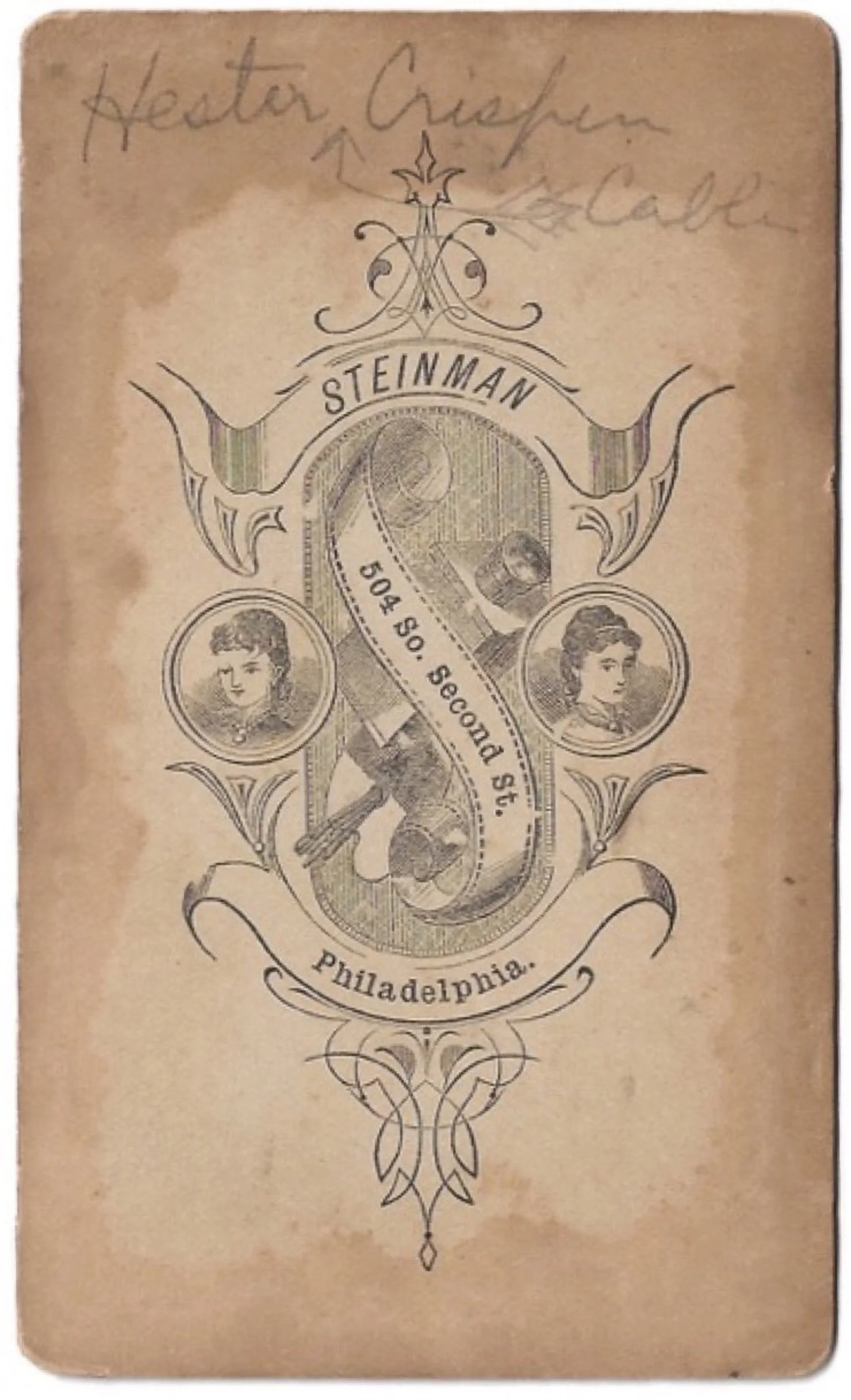Another fun little tidbit before we officially end this family saga - after revisiting Esther and Jacob’s photos, I found they were both taken at the same photography studio: Steinman - 504 South Second St in Philadelphia - albeit probably at different times, because the photographer’s logo differs between the two CDVs. Love little details like that!